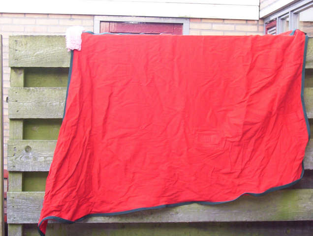 Rode zomerdeken te koop. Onderlengte 175 cm. Deken is amper gedragen en daarom in nog een zeer goede staat. Voor is een sluiting en achter is de mogelijkheid voor bilkoorden. Vrp. 20 excl. verzendkosten. Voor meer info: rooschess@hotmail.com